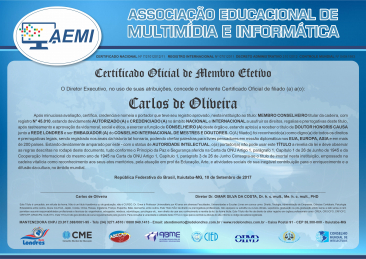 O Título de filiação ASSOCIAÇÃO EDUCACIONAL DE MULTIMÍDIA E INFORMÁTICA é reconhecido internacionalmente como órgão representativo da comunidade.
