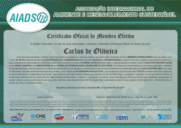 O Título de filiação ASSOCIAÇÃO INTERNACIONAL DO AMBIENTE E DESENVOLVIMENTO SUSTENTÁVEL é reconhecido internacionalmente como órgão representativo da comunidade.