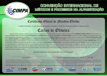O título de membro CONVENÇÃO INTERNACIONAL DE MÉTODOS E PROCESSOS NA ALFABETIZAÇÃO é concedido a personalidades que tenham grande importância nos âmbitos social, cultural, científico, filosófico. Para fazer jus a este elevado e soberano título não é necessário fazer algum curso/concurso, ou defender tese, trata-se de um TÍTULO INTERNACIONAL.
